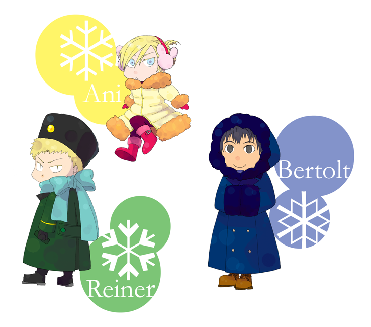 ベルライアニの鼻がロシア系?なのが気になってます。 壁外の人間と関係あるのかな。 とりあえずロシアっぽい服を着せてみました。 アニはもうちっとレトロな雰囲気にしようかなとも思ったんですが、 絶対白系のダウンコートが似合うはず!と思ってこうなりました。 ベルトルトの色黒さが何だか…雪焼け…?(笑) ライナーはアニメ2話でも首(?)に巻いてましたのでマフラーでぐるぐる巻き。趣味です(キリッ)。