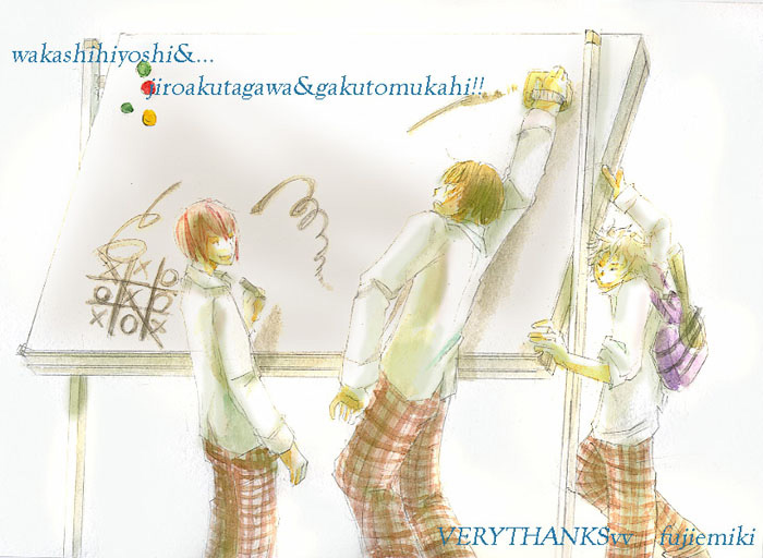 紫吹トモコ嬢&茶屋木立嬢のサイトでキリ番8888を踏んだので 「日吉で遊ぶ氷帝ミニマムズ」をリクエストさせて頂きました〜! どうもありがとう!とっても可愛い! アナタ達が、私がどんな無理難題なリクを注文してくるか不安がっていたのを忘れない(笑)! この絵を描いてくれたのは紫吹嬢です。